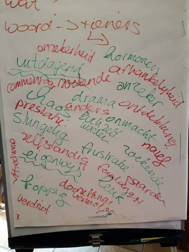 Ook tijdens deze nascholing kon ik weer rekenen op verhalen en ervaringen vanuit verschillende achtergronden. Een instructeur van een reguliere manege, mensen met een zorg-manege, iemand uit coaching wereld, moeders met paardendochters en instructrices van een ponyclub. Totaal verschillende werkzaamheden maar eigenlijk ook behoorlijk overeenkomstig. Want tieners zijn overal hetzelfde. Na het eerste uur stond het bord al vol met woorden die zomaar kunnen passen bij de hobbelige route die de weg naar volwassenheid kan zijn.