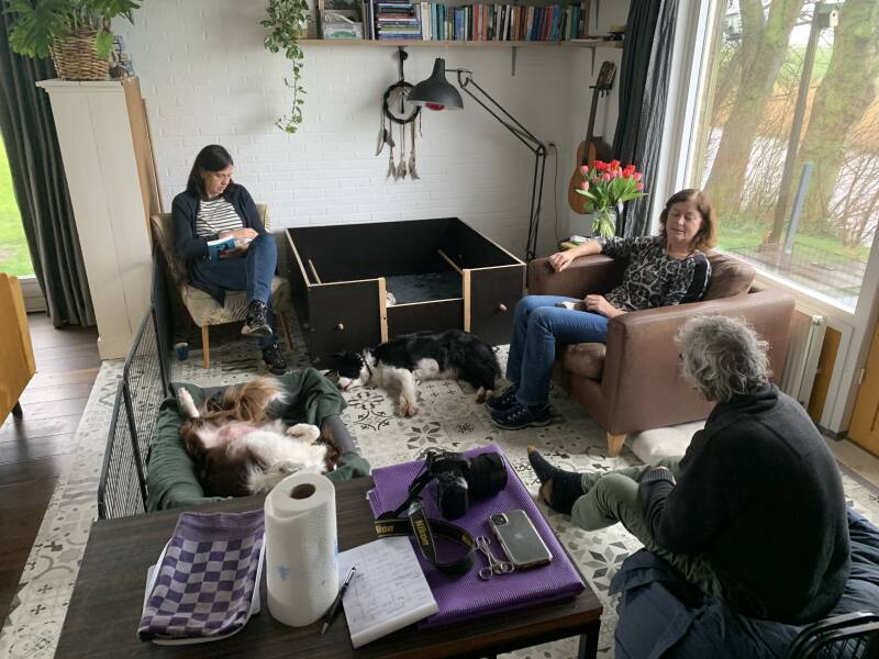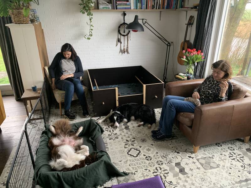 Wauw, wat een knapperds! Vandaag kwamen vriendinnen Karin & Jannieke op bezoek. In eerste instantie voor ons, totdat ze de pups zagen (ik was dat vergeten te vertellen toen we onze date maakten), toen waren ze verkocht. En wij eigenlijk ook. Want wat is het aandoenlijk leuk om te zien hoe de kleintjes nu al bij vreemde mensen een tukkie doen. In alle vertrouwen even slapen op benen die anders ruiken en voelen dan bekend. Tib bewaakt de kist en Yuka mag even een time-out nemen. Geweldige samenwerking!