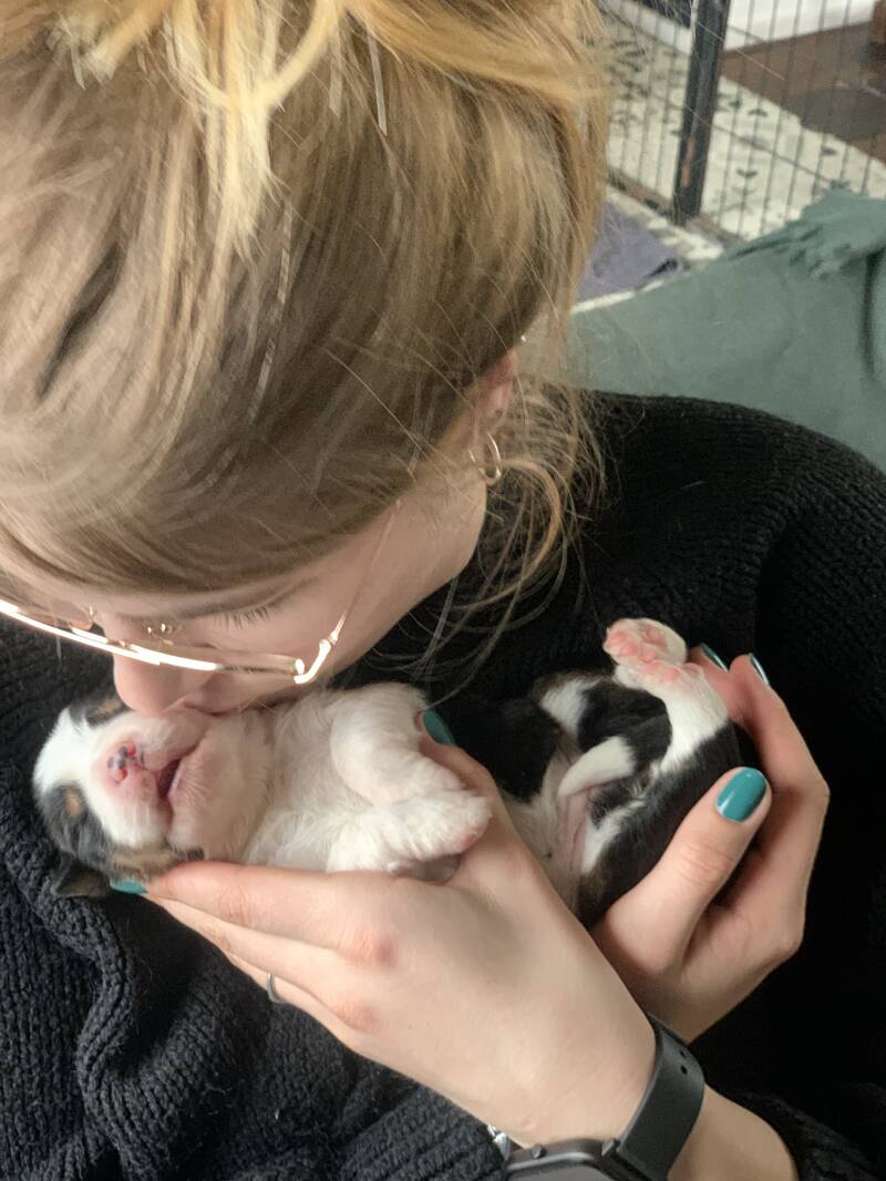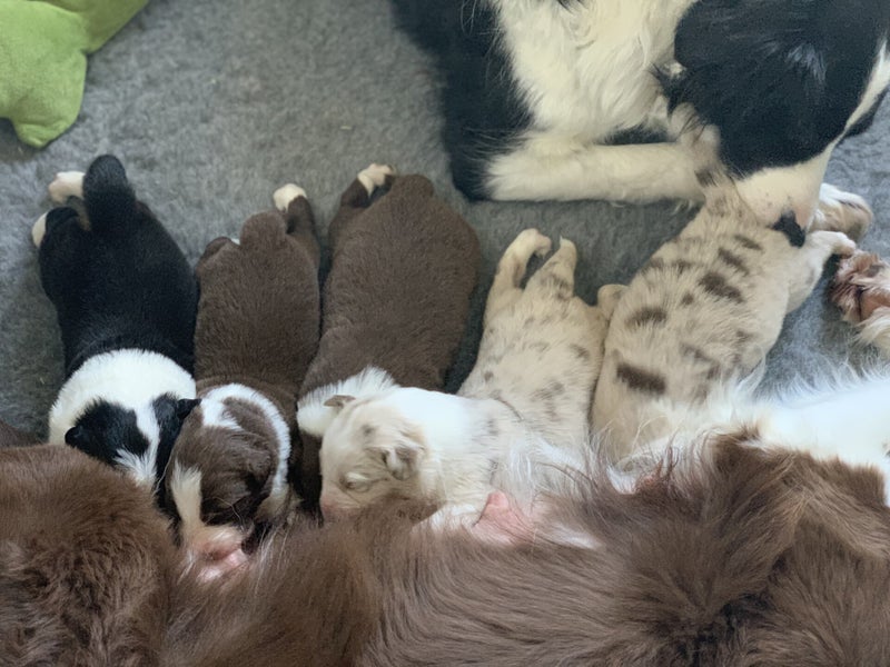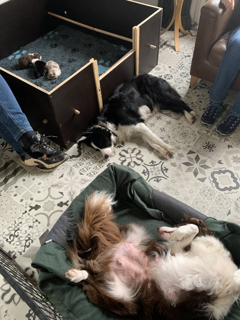 Verder neemt oma Tib regelmatig zorgtaken over en likt de pups dan helemaal schoon. Zodra de pups proberen bij oma te drinken, is het afgelopen met het feest. Dan moet oma de kist uit. Vorige keer hebben wij dat wel eens over het hoofd gezien en leek het alsof er zelfs uiers ontstonden. Tib vond dat allemaal best, maar het lijkt ons toch niet helemaal de bedoeling.