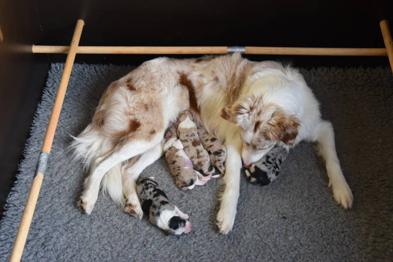 Nou heb ik toch al vier eerdere nestjes gehad met mijn eigen honden en toch heb ik me laten overvallen door de natuur. Gistermiddag is Cato, 5 dagen eerder dan verwacht, razendsnel bevallen van 5 prachtige pups! Een reu en vier teefjes. Twee blue merle en drie red merle.
